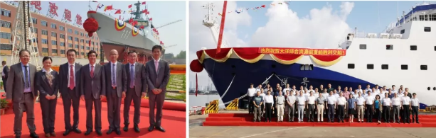 以上左圖:馬來(lái)西亞瀕海任務(wù)艦首艦“KERIS”號(hào)下水;右圖:“大洋號(hào)”綜合資源調(diào)查船交船儀式。