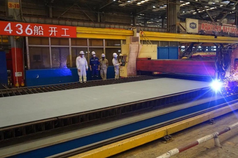 ????5月19日,中國船舶集團旗下外高橋造船為PTM公司建造的11.4萬噸阿芙拉油輪2號船H1436船順利開工。本項目也是繼5月12日首制船H1435船順利開工時隔一周后雙方再度攜手合作實現的又一重要節點。受疫情影響,船東駐廠組代表無法到場,委托美國船級社(ABS)代表驗收開工鋼板情況見證鋼板切割并以“云簽字”的形式,簽署開工節點證書。