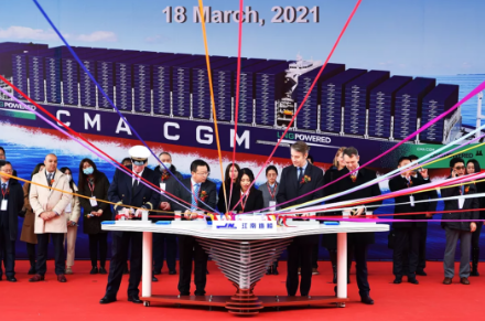 2020年9月22日,滬東中華為達(dá)飛集團(tuán)建造的全球首艘23000TEU超大型雙燃料集裝箱船“達(dá)飛雅克?薩德”號(hào)命名交付,標(biāo)志著中國(guó)船舶集團(tuán)在世界大型集裝箱船領(lǐng)域成功實(shí)現(xiàn)從跟隨到引領(lǐng)。