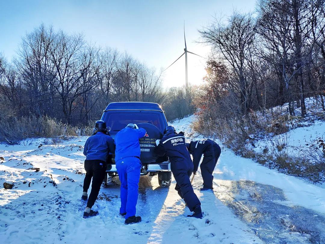 進入11月,內蒙古自治區錫林郭勒盟地區迎來大面積的暴風雪,烏達萊項目人員在趕往風場的路上遭遇積雪路段,雖然氣候嚴寒,但為了及時消除機組故障,大家在積雪路段采取挖雪推車的方式齊心協力,一同開展清理路面積雪的行動。這個冬日,冰雪阻擋不住海裝追風者們勇往直前的步伐,他們只為恪盡職守完成一個承諾——風機旋轉、帶來光熱。